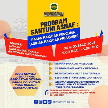 PENAFIAN : Pihak Majlis Agama Islam Melaka (MAIM) tidak akan bertanggungjawab bagi apa-apa kehilangan atau kerugian disebabkan oleh penggunaan mana-mana maklumat yang diperolehi dari laman web ini serta tidak boleh ditafsirkan sebagai ejen kepada ataupun syarikat yang disyorkan oleh MAIM.