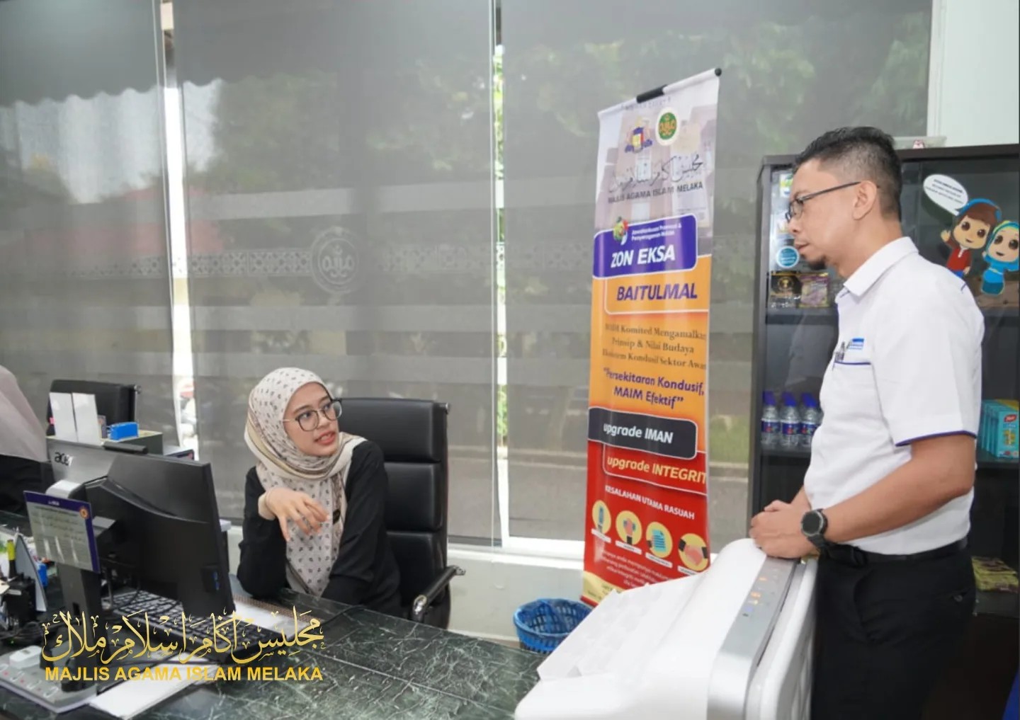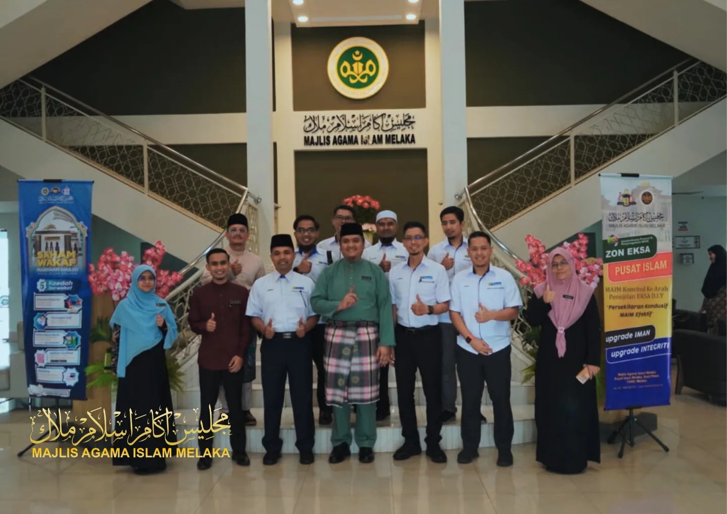 Delegasi disambut mesra Pengurus Baitulmal MAIM, Tuan Haji Mohd Hairulamin bin Mohd Sis dan bergambar bersama Penolong Setiausaha Bahagian Agihan Zakat MAIM, Puan Rohaizah binti Abas dan Penolong Setiausaha Bahagian Komunikasi Korporat, Promosi dan Penerbitan MAIM, Puan Arina Saffuraa binti Alim.