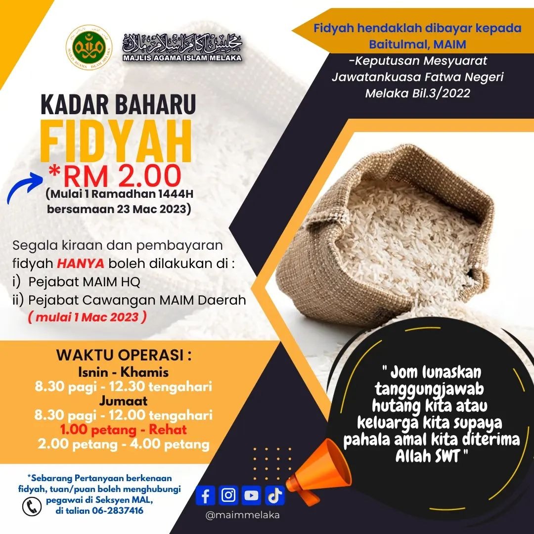 Kadar Baharu Fidyah berkuatkuasa 1 Ramadhan 1444H bersamaan 23 Mac 2023 adalah RM2.00.