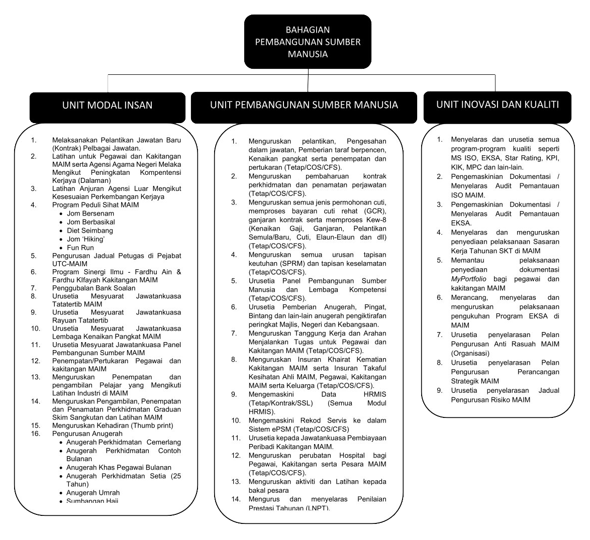 - Menyelaras dan menguruskan penyediaan pelaksanaan Sasaran Kerja Tahunan SKT di MAIM.